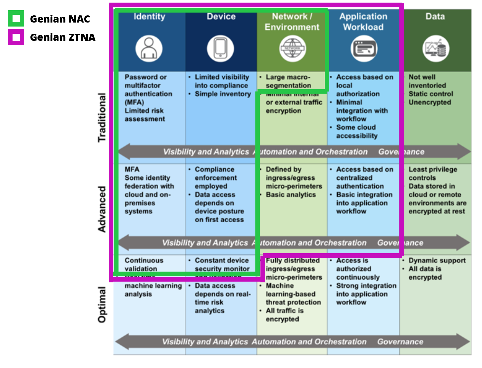 Initially developed as a roadmap for federal civilian agencies, CISA’s ZTMM offers clear benefits to any enterprise organization needing to develop cybersecurity strategies and plans for zero trust adoption. ZTMM is structured around five key pillars: Identity, Devices, Networks, Applications & Workloads, and Data. It incorporates three overarching capabilities: Visibility & Analytics, Automation & Orchestration, and Governance. Genians is able to address the critical capabilities illustrated below by leveraging its Network Access Control (NAC) and Zero Trust Network Access (ZTNA) solutions.