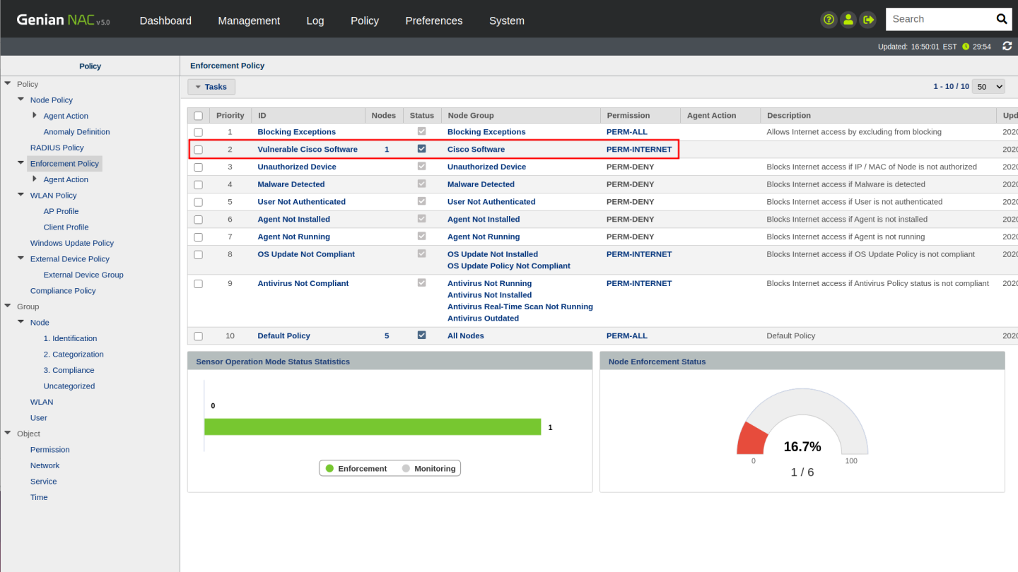 Next, create an Enforcement Policy linked with this group by navigating to Policy > Enforcement Policy > Tasks > Create. If you want, you can configure permission to limit network access for these nodes. In this example, we will use the “Perm-Internet” permission, which will only allow traffic destined for network locations outside of the devices network, where a Genians sensor is not deployed.