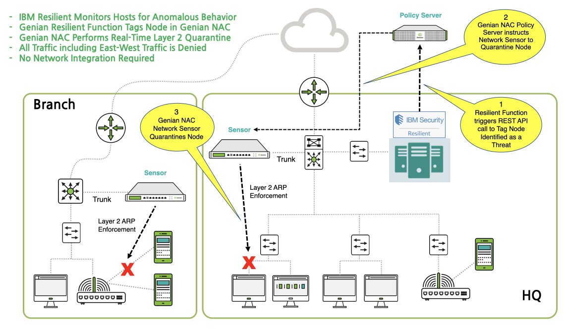 Identifying threats and automating actions to external systems through applications is a core function of IBM Resilient. However, the external system performing the action is where the true quarantine capability comes into play. The architecture of that system will determine how effective the quarantine is, as well as how difficult it is to implement. When Resilient detects a threat, an API call is made to Genian NAC to dynamically assign a Tag to the network node. The software-defined tag can restrict access or quarantine the node. This takes place in real-time using Genian NAC ARP Enforcement. With no reliance on network infrastructure, it is truly vendor agnostic and can be rapidly deployed, unlike legacy NAC enforcement models.