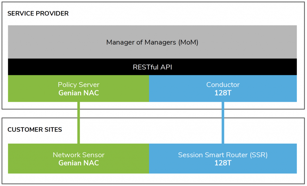 Between Genians and the 128T Networking Platform, RESTful and Netconf APIs provide a full suite of integration capabilities with applications, orchestration, and automation tools. Fine-grained contextual analytics provide application and compliance insights that are exported to third-party big data and analytics solutions.