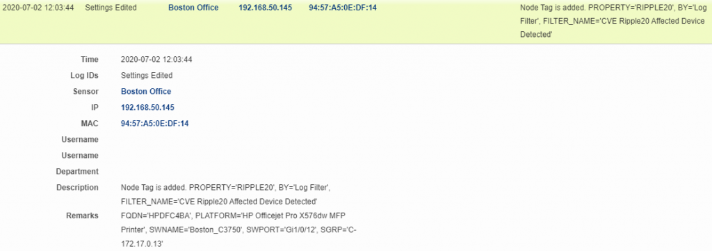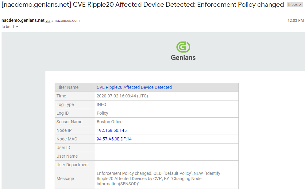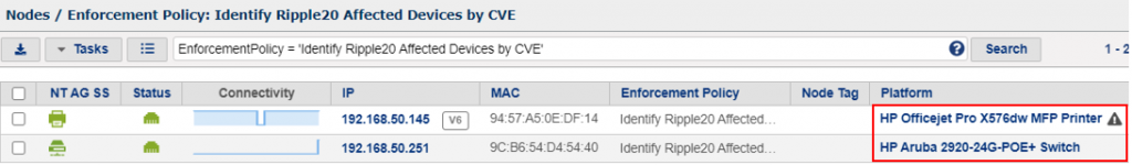 Whether you opt to use the Device Platform as a way to check for Ripple20 devices or the CVE list as demonstrated above, the ability to rapidly deploy a Genian NAC physical or virtual Sensor, group and tag affected nodes on the network and fully automate notifications via any number of collaborative tools is a huge time saver.