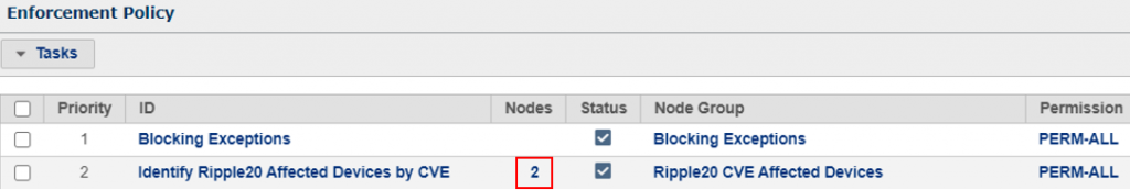 To identify these devices, we will create a Node Group and Enforcement Policy in the Genian NAC UI. The Node Group will list the 19 Ripple20 CVEs and the Enforcement Policy will allow for options later on for isolating or restricting the devices. In this example, as in the previous blog post, we will not restrict permissions since we are just auditing to locate vulnerable devices.