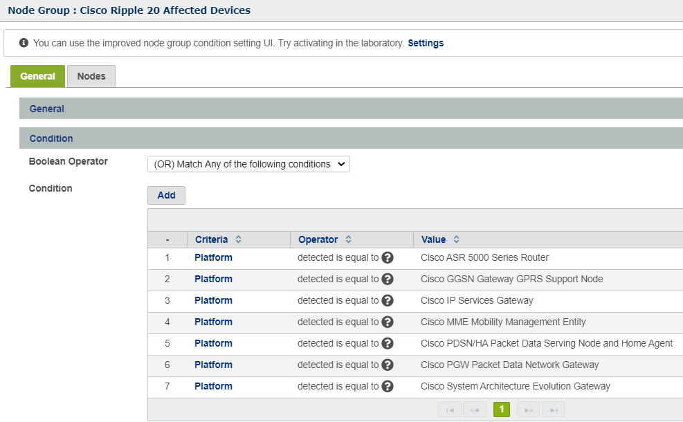 To identify these devices, we will create a Node Group and Enforcement Policy in the Genian NAC UI. The Node Group will list the Cisco confirmed vulnerable devices from the list above and the Enforcement Policy will allow for options later on for isolating or restricting the devices. In this case, since we are talking about networking gear, we will skip restricting access.